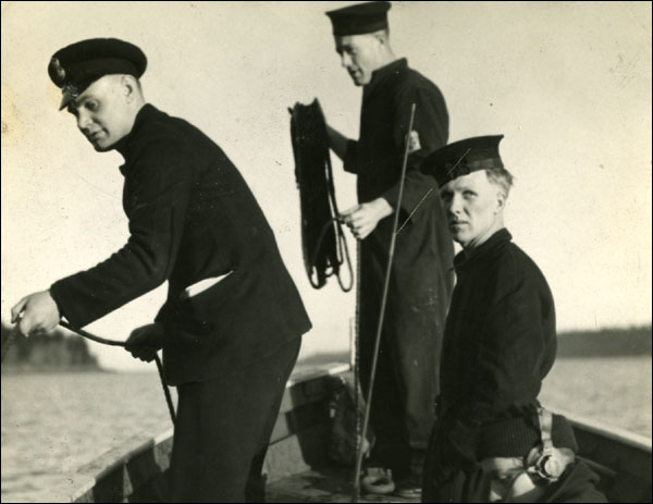 Jim White (à droite) natif de Greenspond, Terre-Neuve, et deux autres membres de l'équipage non identifiés.