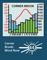 Surface wind speeds at average 20-30 km/hour around the coasts, with 50-80 km/hr typically sustained during low pressure systems (see climagraphs: St. John's, St. Lawrence, Port aux Basques, Battle Harbour, with legend. Very strong gusts (120-140 km/hr) are a feature along the south and west coasts of the island, whenever strong offshore winds descend from the hills immediately inland, especially where narrow valleys exit towards the sea (for example the Wreckhouse area, near Port aux Basques, and Western Brook Pond outlet at Gros Morne National Park).