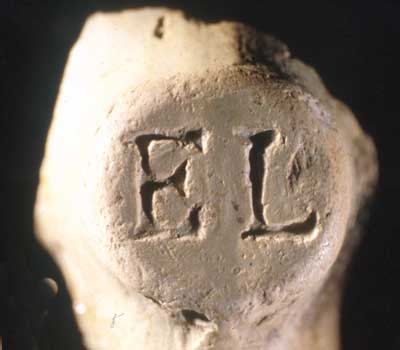 EL Incuse. Stamped on heel. Stem bore size: 8/64ths. Fragment of stem and heel only, but mark identified as Bristol pipemaker Edward Lewis (1631-40/1) or Elizabeth Lewis (1652) (Walker 1977:1456).