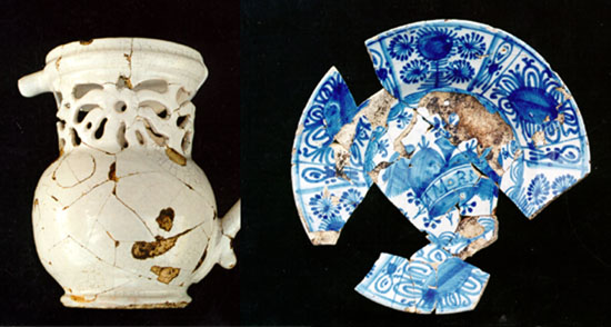 Ceramics from the midden include fragments of many expensive tin-glazed (Delft) vessels. The "puzzle jug" on the left in the image below was probably made in the Netherlands in the second half of the 17th century. The Portuguese plate on the right bears the word "Amors," (love) and was sometimes used to carry rings at a wedding ceremony.