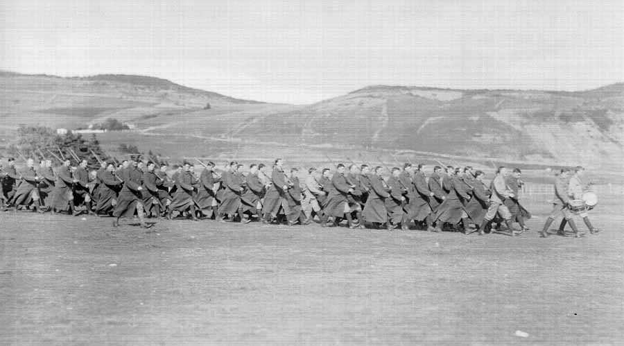 Taken by Robert Palfrey Holloway, Holloway Studio (St. John's, NL). Marching to city after dinner at Smithville prior to embarking overseas.