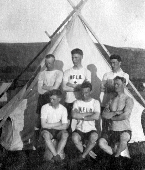 Deuxième rangée: Bren Sinnott (no rég. 830); Archibald Gooby (no rég. 154); Fred LeGrow. Remarquez les maillots avec les initiales « N.F.L.D. » [Terre-Neuve]