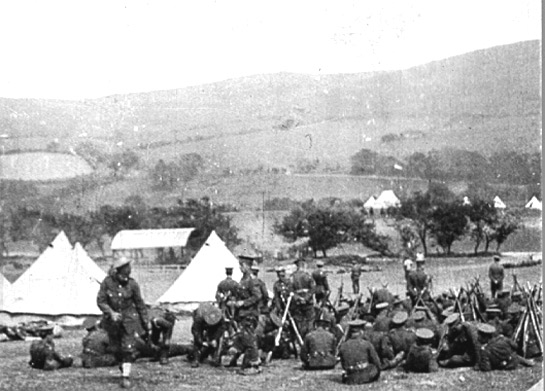 Des soldats au repos posant devant des tentes. Le soldat montant la garde près du centre de la photo tient un fusil Ross.