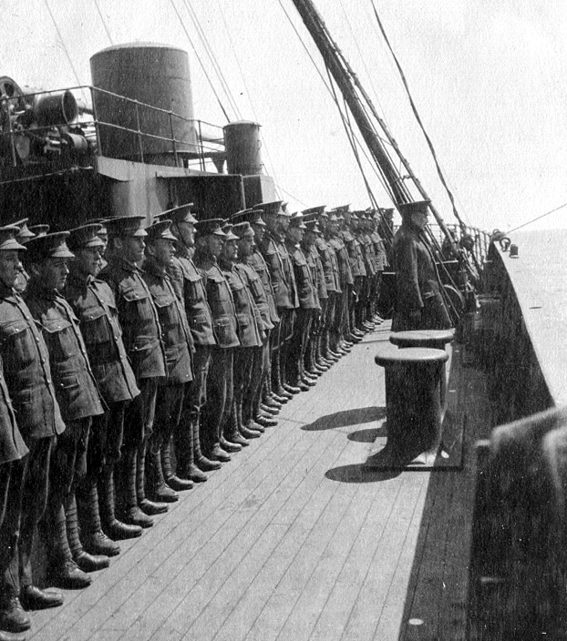 Photo prise par Holloway Studio (St. John's, T.-N.-L). Remarquez les couvre-chefs des soldats. À gauche, deux femmes sur le pont inférieur.