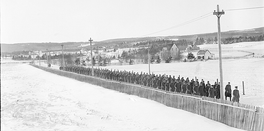 Photo prise par Robert Palfrey Holloway, Holloway Studio (St. John's, T.-N.-L.). Marche vers la ville après un repas à Smithville, avant l'embarquement vers l'étranger.
