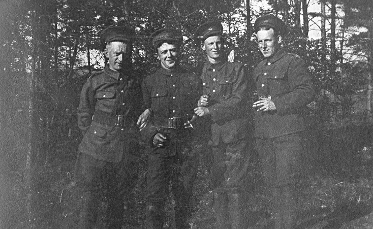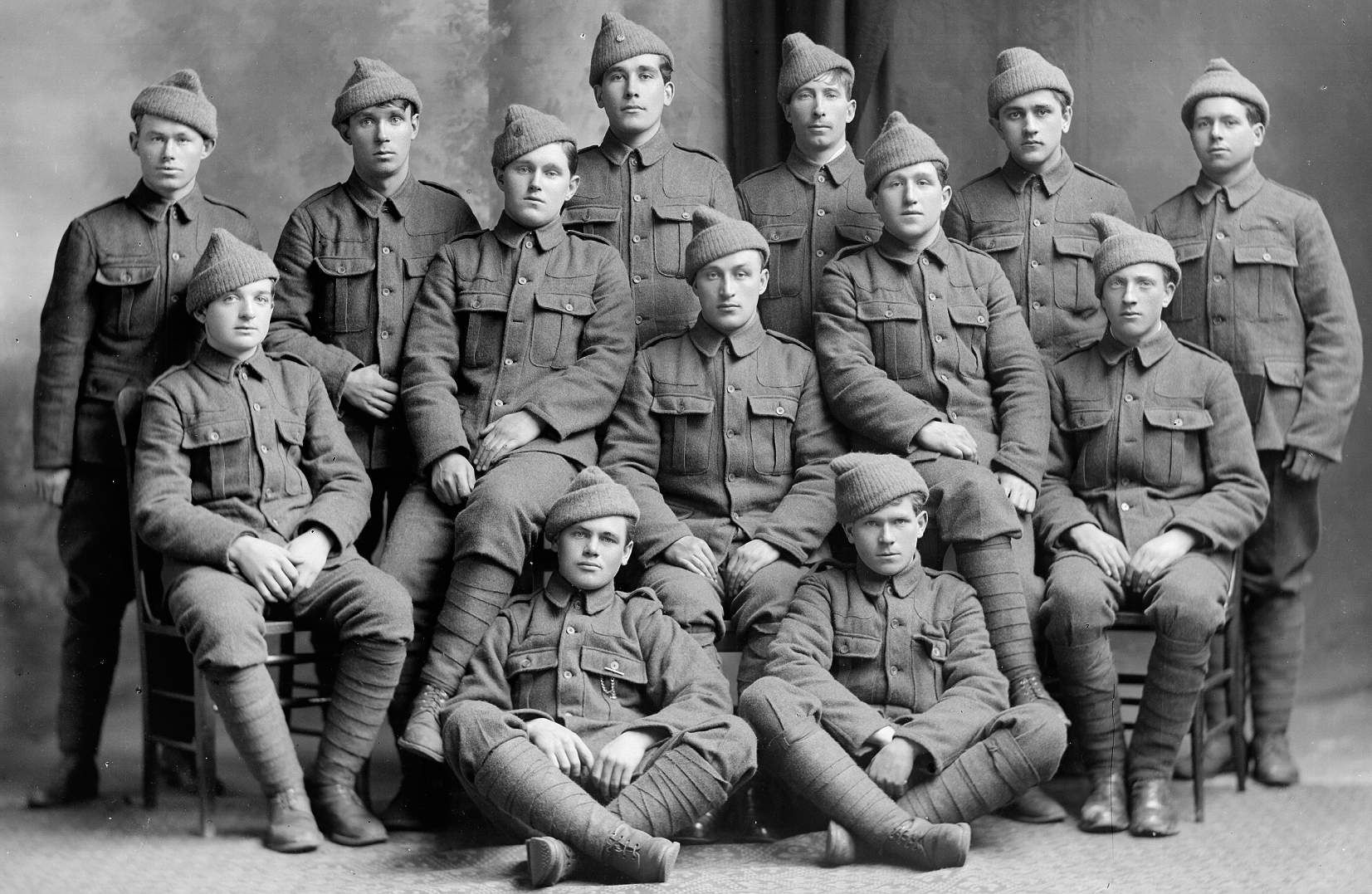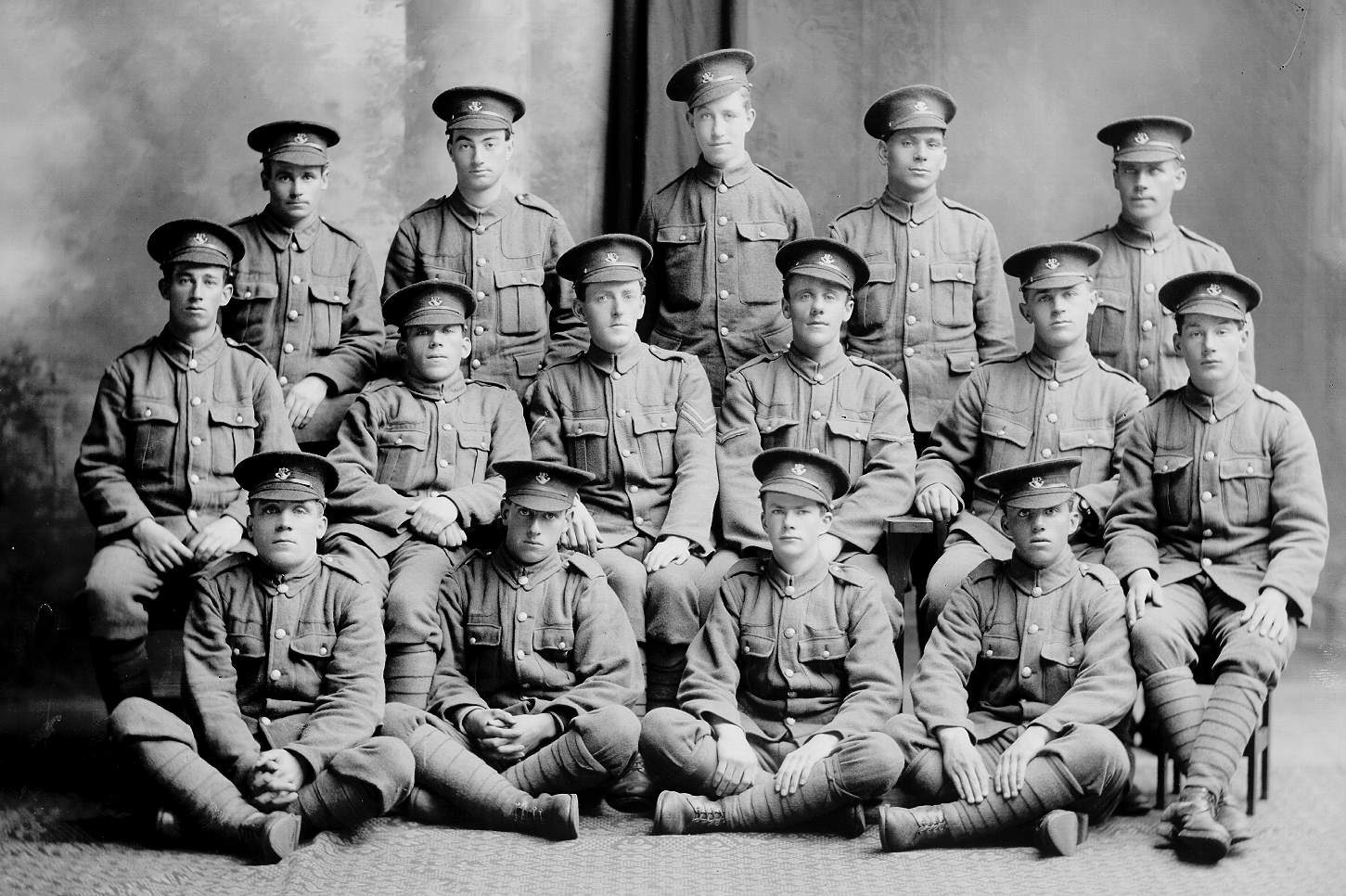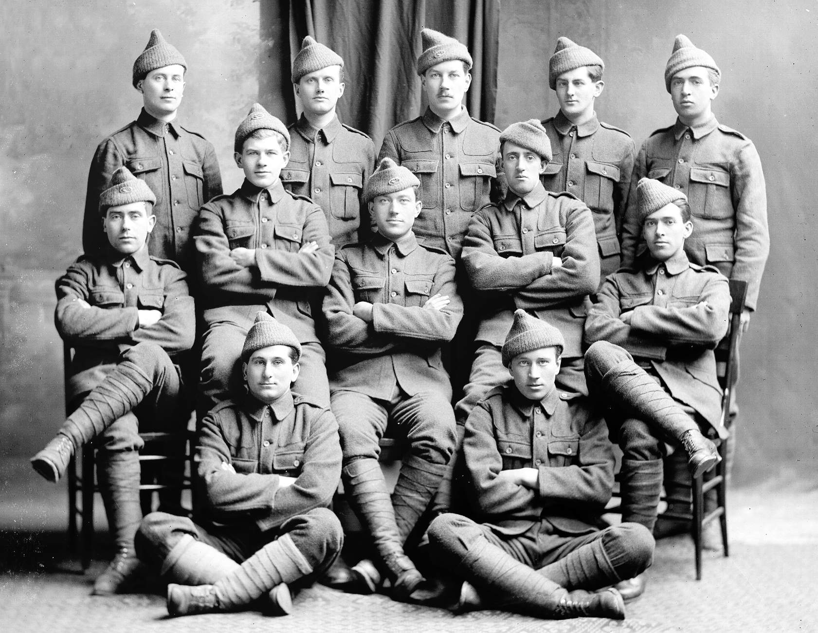 27 juillet 1917. Portrait en studio. Identifiés au verso de la photo: Taylor Parsons (no rég. 3916); Samuel Hollett (no rég. 3877); Joseph Allen Clarke (no rég. 3857); Malcolm J. Bishop (no rég. 3901); John Manuel (no rég. 3902); James C. Abbott (no rég. 8414); George Langer (no rég. 3805); Cecil Roberts (no rég. 3908); Levi Hussey (no rég. O-284 - 3913); William Parsons (no rég. 3917); Augustus J. Walsh (no rég. 3914); Robert Hann (no rég. 3915); James Delaney (no rég. 3878); Ephrain Stickland (no rég. 3886); Walter Combden (no rég. 3909); Michael Marry (no rég. 3903); Harold Yates (no rég. 3910); Chesley Reid (no rég. 3912); T. Power (no rég. 3850); E. Brown; Robert Peel (no rég. 3888). E. Brown est peut-être Edward Brown (no rég. 3804) ou Everett Brown (no rég. 3829).